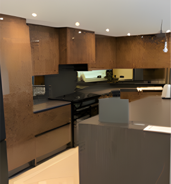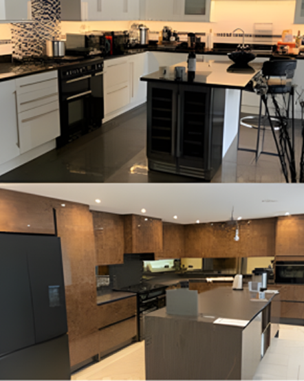 A striking central island with waterfall worktops now acts as both a practical workspace and a social focal point—ideal for entertaining. Layered lighting, including statement pendants and subtle LED accents, adds warmth and depth, echoing a high-end Manhattan-inspired style.
