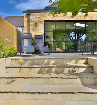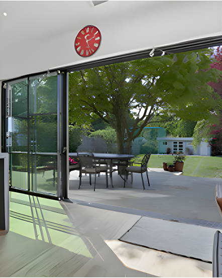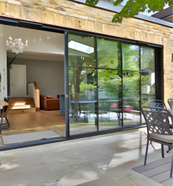 The patio has been thoughtfully designed to sit level with the internal floor, enhancing flow and usability while making the space ideal for entertaining. During the warmer months, the doors can be fully opened to extend the living area into the garden, while in cooler seasons, large panes of glass maintain uninterrupted views and allow natural light to flood the interior.