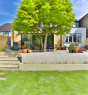 The new design centres around a generous open-plan kitchen, dining, and living area, carefully configured to create a sociable and functional space for everyday living. Full-width glazed doors span the rear of the property, opening directly onto a raised patio and creating a seamless transition between indoors and out.